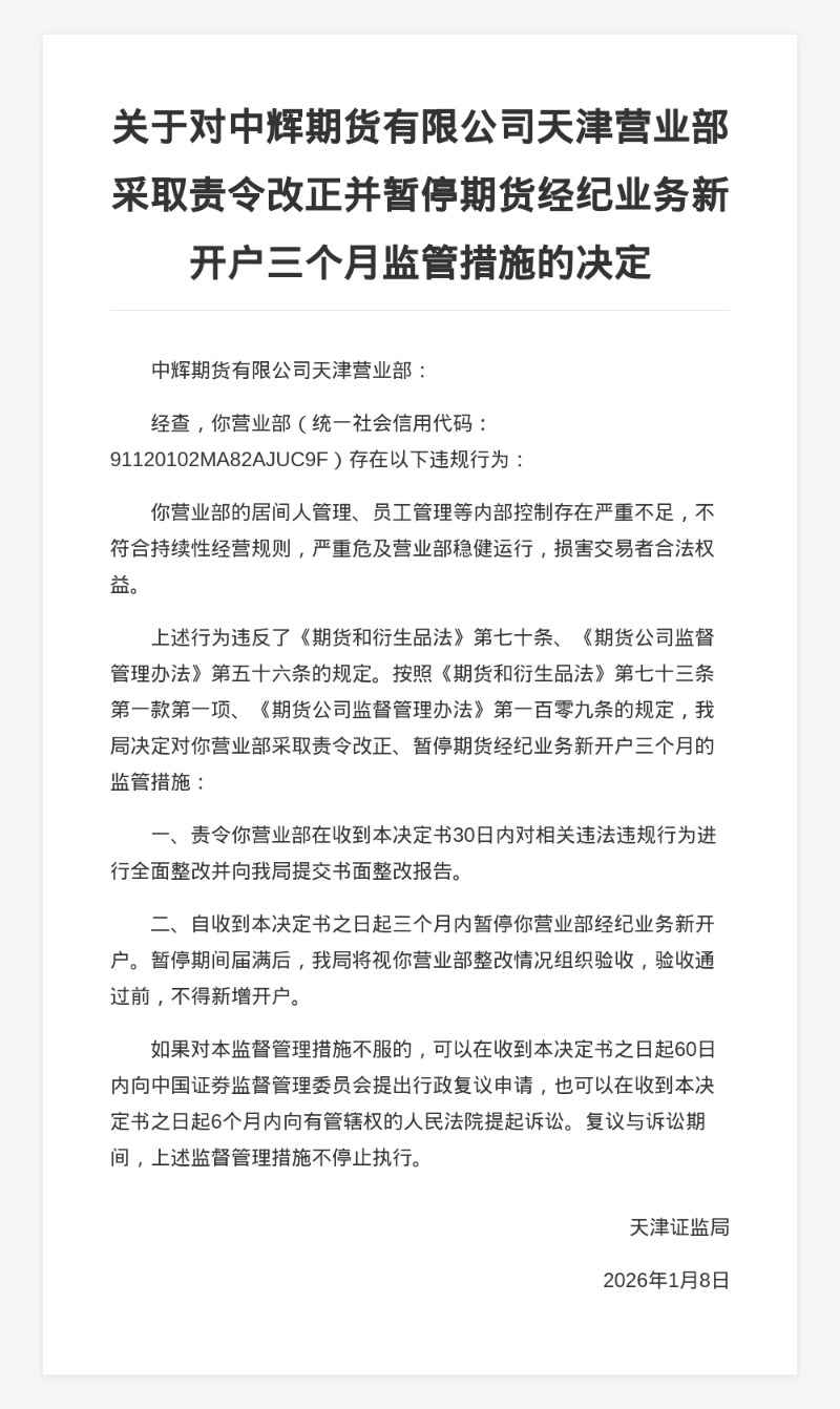 上述行为违反了《期货和衍生品法》《期货公司监督管理办法》的规定。天津证监局决定对中辉期货有限公司天津营业部采取责令改正、暂停期货经纪业务新开户三个月的监管措施。