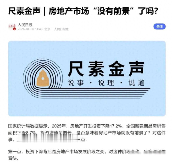 2026年刚开年,官方媒体就接连发声,《求是》提到不要用添油战术,意思是别零敲碎打去救市,《人民日报》也问房地产市场是不是没有前景了,但整篇文章没说要刺激房价,只说稳定预期,这说明政策方向没有改变,不是要把价格拉高,而是要防止大家一下子全跑掉,我看了好几遍,确实没找到回暖反弹这些词,反而反复强调发展阶段已经变了。