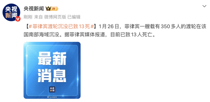 据央视新闻消息,1月26日鹏配资,菲律宾一艘载有350多人的渡轮在该国南部海域沉没。据菲律宾媒体报道,目前已致13人死亡。