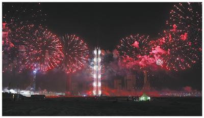 2026年1月1日,标志塔上空烟花绽放。