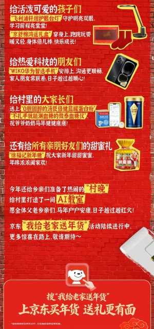 2026年春节,刘强东给光明村乡亲们的年货包括:OPPO、华为手机,福临门米面油,电热毯,微波炉,筋膜枪,护眼台灯,蛋白粉,血糖仪等。还要给村里打造一间AI教室,提供早教益智、阅读成长、乐趣对弈、3D创意等。