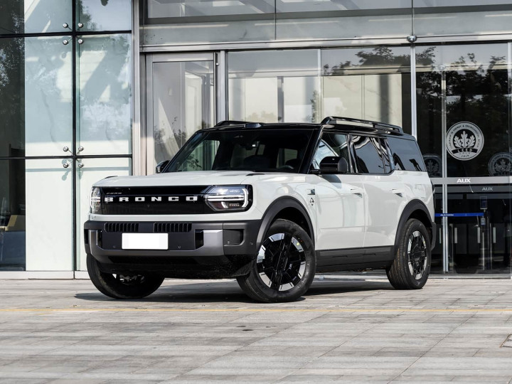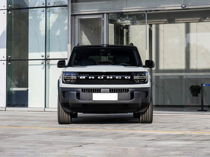 我们首先来看新车的外观设计方面,福特智趣烈马的车头设计延续了烈马家族标志性的“方盒子”轮廓,但通过新能源化的前脸语言赋予其更强烈的科技感与辨识度。前脸采用封闭式格栅布局,中央嵌入可点亮的“BRONCO”字母标识,与两侧圆形数字化LED大灯相连,形成横跨车头的动态光带,夜间点亮时犹如烈马奔腾的光影流动,兼具安全性与视觉冲击力。前保险杠采用双层结构化设计,上层为蜂窝状散热格栅,保障散热效率