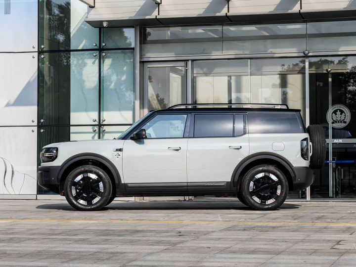 再来看车身侧面部分,车身侧面以经典的“方盒子”造型呈现,平直的肩线设计与D柱小窗的抬起,延续了硬派越野车的典型元素。5025mm×1960mm×1815mm的车身尺寸与2950mm轴距,在同级中属于标准中型SUV范畴,但通过隐藏式门把手与18英寸越野风格轮毂的组合,既优化了0.35Cd的超风阻系数,又兼顾了实用性与美观性。并且宽大轮眉与短前后悬设计,进一步强化了硬派越野的视觉张力。