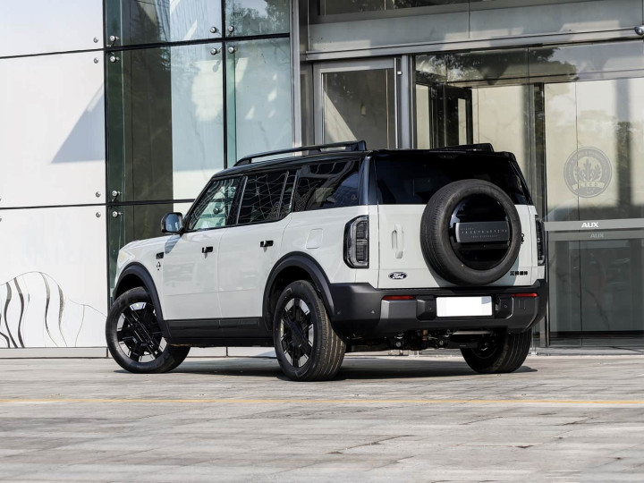 再来看车尾部分,车尾设计延续了烈马家族的经典元素,外挂式全尺寸备胎、侧开式尾门及竖向尾灯组的核心设计语言得以保留,形成极具辨识度的视觉标识。全尺寸备胎罩表面采用立体压印工艺呈现“BRONCO”字样,罩盖边缘嵌入的LED灯带与前脸灯光系统形成呼应,在强化设计统一性的同时提升了夜间辨识度。
