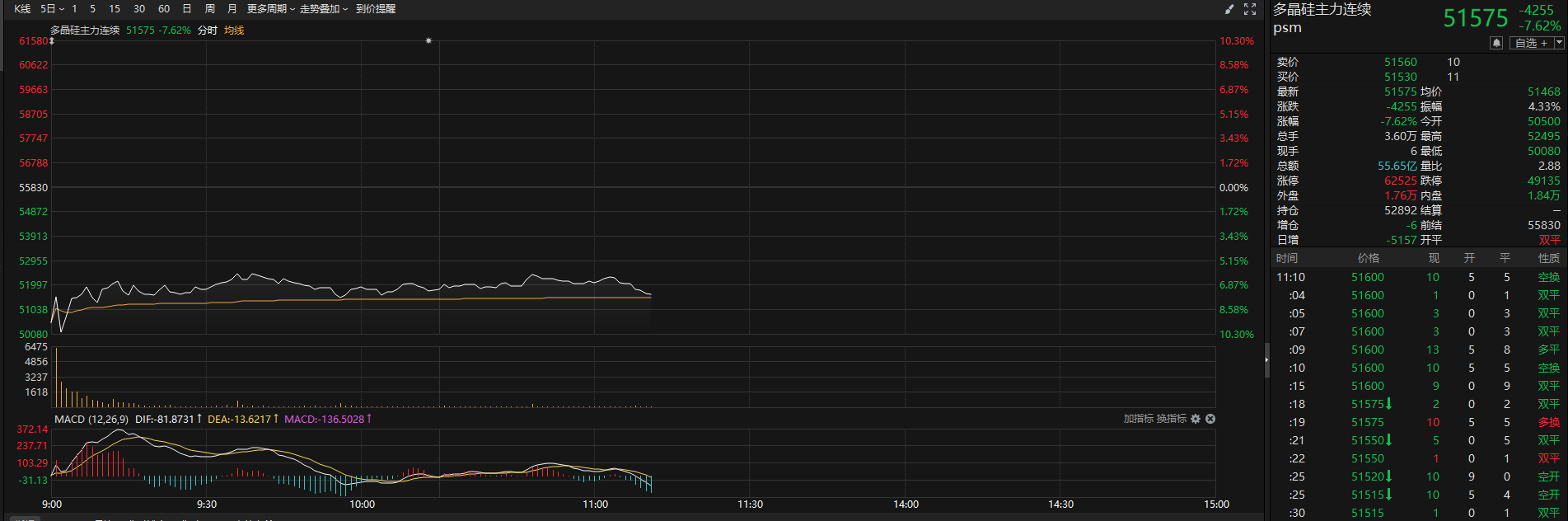 上证报中国证券网讯(记者王玉晴)继1月8日跌停后,1月9日上午,多晶硅期货主力合约跌超7%,截至11时10分道正网配资,下跌7.62%,报51580元/吨。