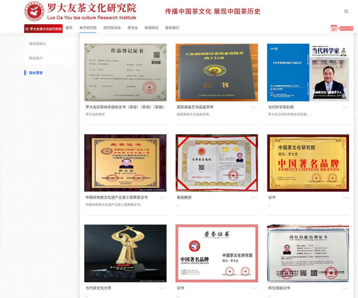 罗大友发起的“中国茶文化研究院”网站上公开的“荣誉证书”(截图)